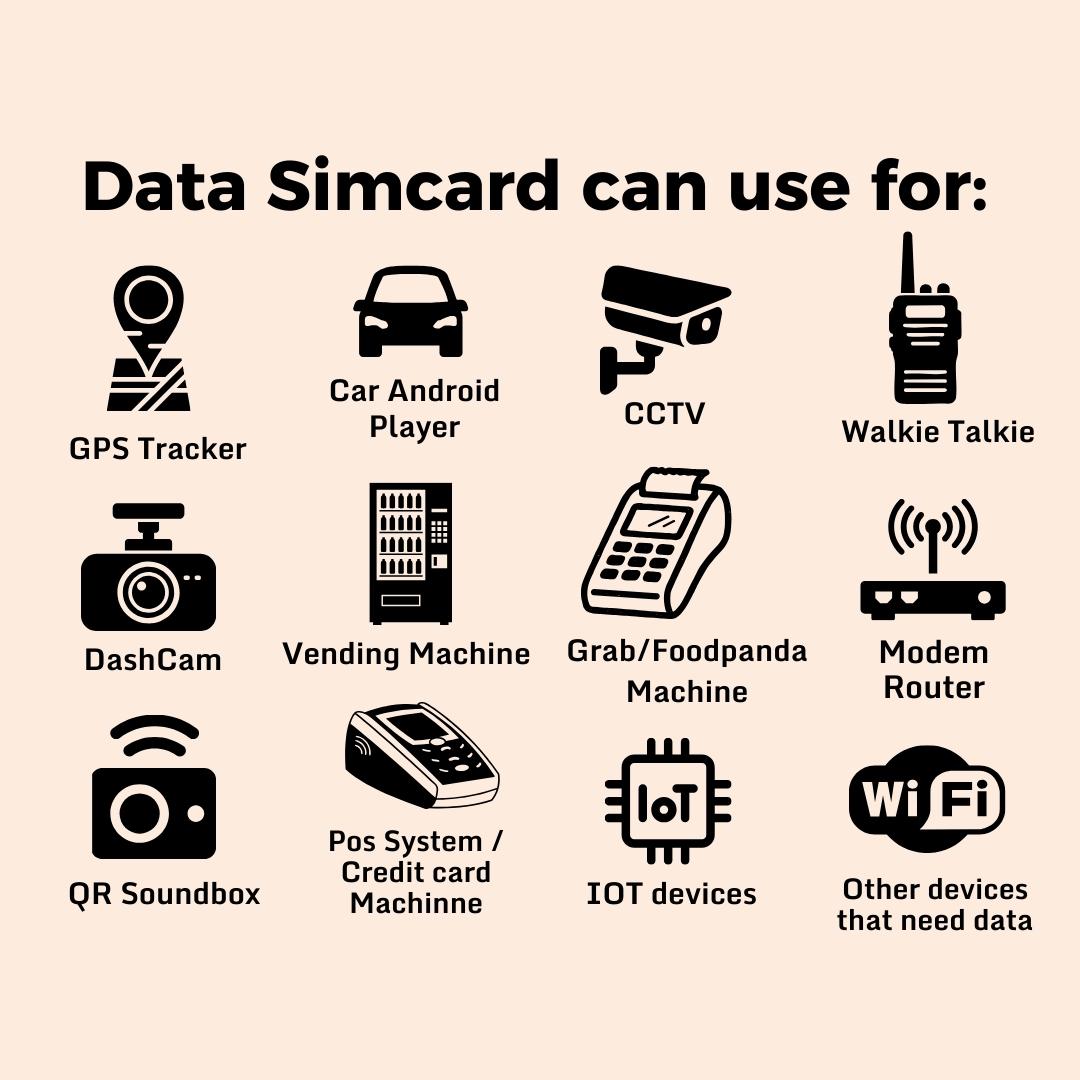This SIM card is a data-only SIM, specially designed for devices that require continuous mobile internet connectivity such as GPS Trackers, Car Android Players, CCTV, Dash Cams, Vending Machines, POS Systems / Credit Card Machines, QR Soundboxes, Modem Routers, Pocket WiFi, Walkie-Talkies, IoT and M2M devices, and other devices that require mobile data.